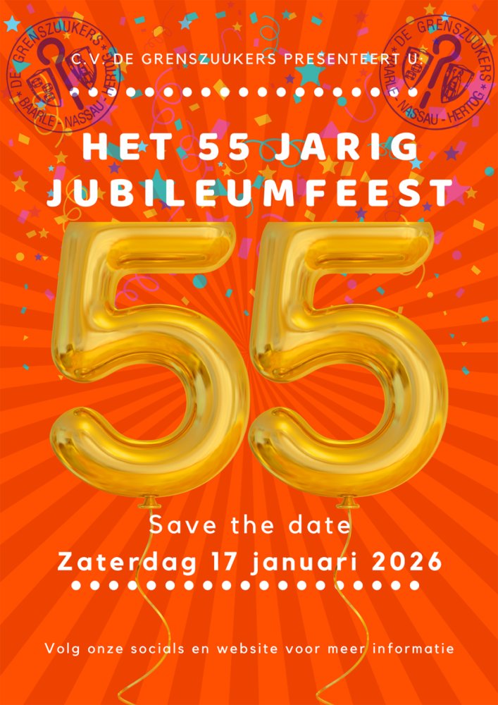 C.V. De Grenszuukers bestaan in 2026 maar liefst 55 jaar: 55 jaor die handjes op mekaor! Zo’n mijlpaal laten we natuurlijk niet ongemerkt voorbijgaan. Op 17 januari 2026 gaan we het met mekaor vieren tijdens ons groot jubileumfeest. Hou die dag vrij in je agenda… en misschien de volgende ochtend ook.