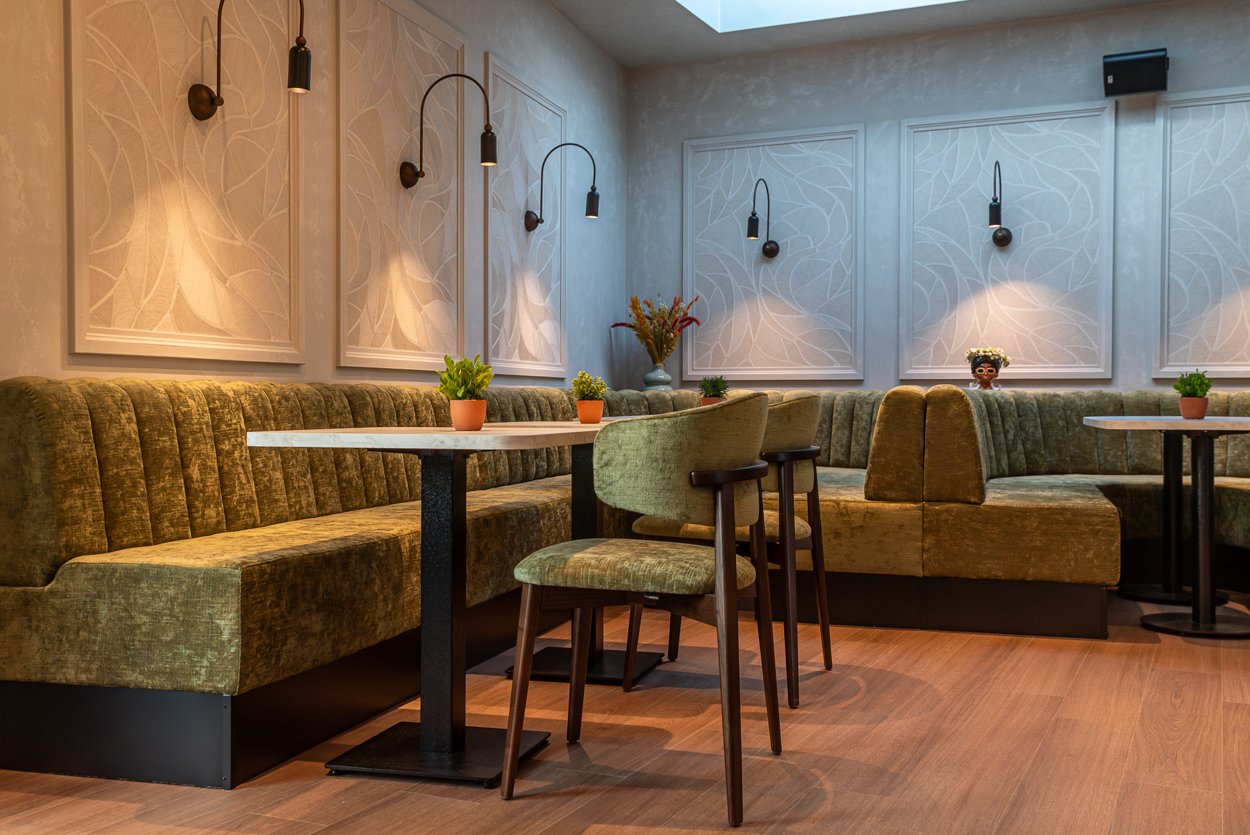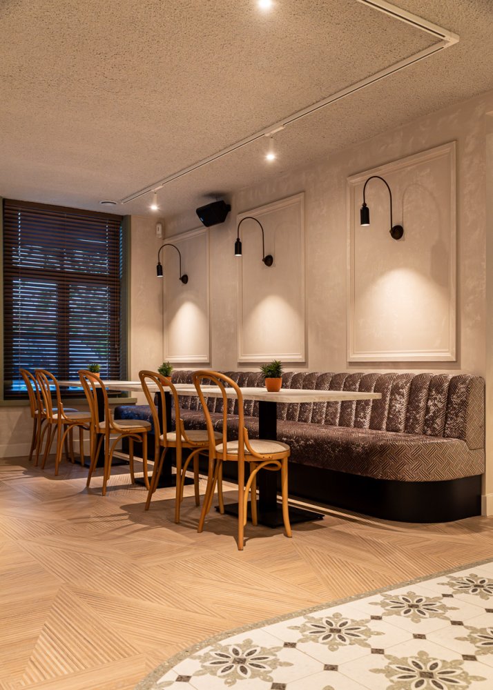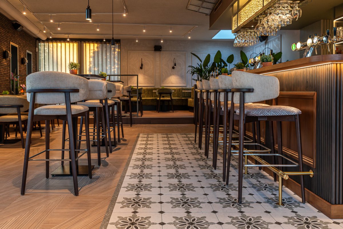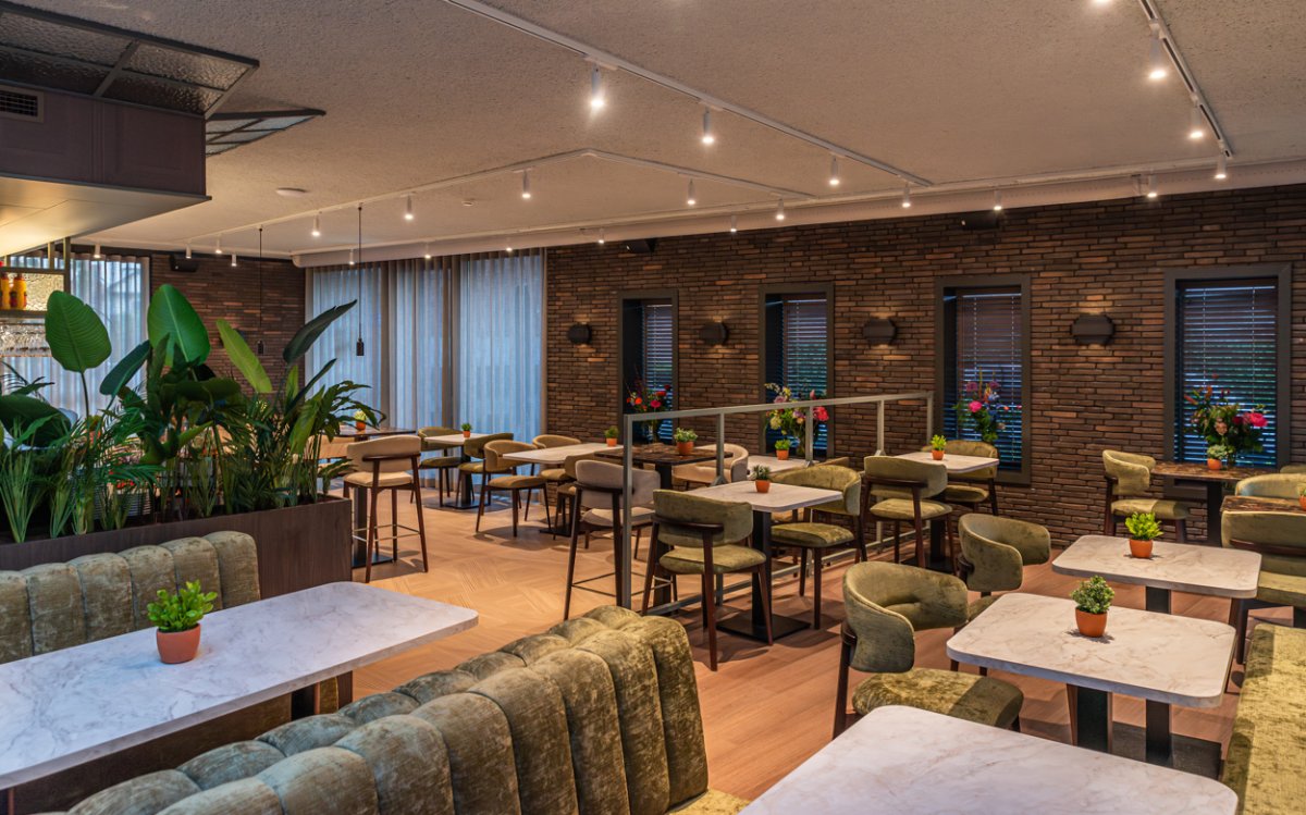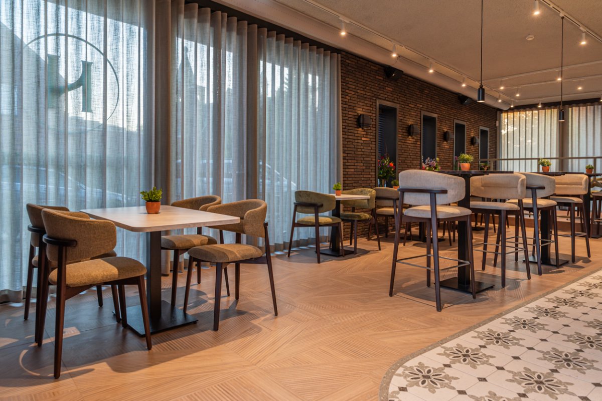 De nieuwe locatie is prachtig: het pand dat ooit dienstdeed als oude ambstwoning – een gemeentelijk monument – onderging een ingrijpende verbouwing. Samen met interieurontwerper Art2Go werd het pand omgetoverd tot een grandcafé met 275 m², zo’n 80 zitplaatsen binnen, 90 terrasplekken en zelfs een ruimte voor private-dining . Materialen als donker hout, marmer, warme stoffen en een mix van lage en hoge tafels geven het geheel een warm, modern én klassiek karakter. De sfeer ademt ‘stadse allure’ zonder dat het afstandelijk wordt – het blijft laagdrempelig wat betreft sfeer, beleving en prijs.