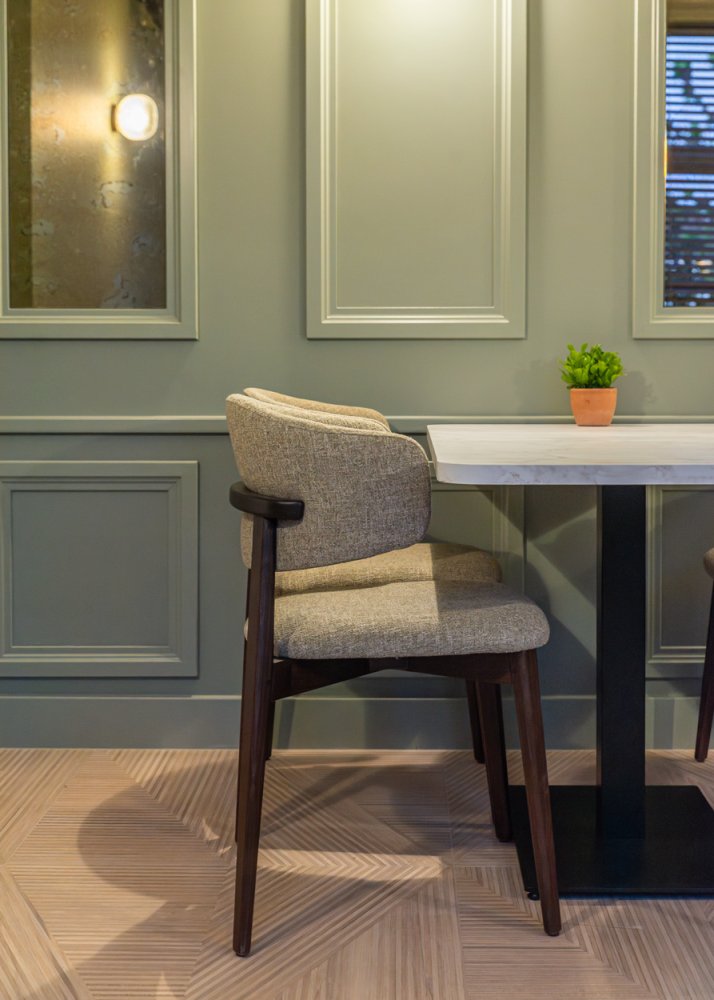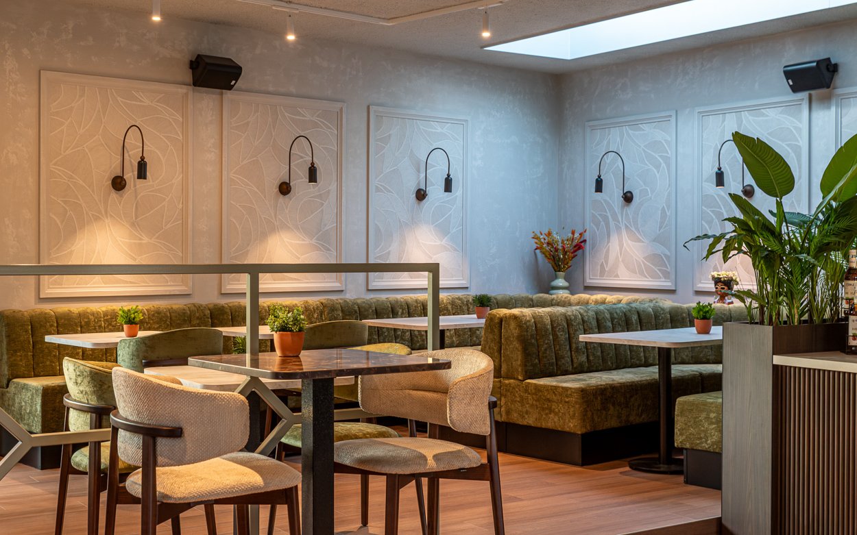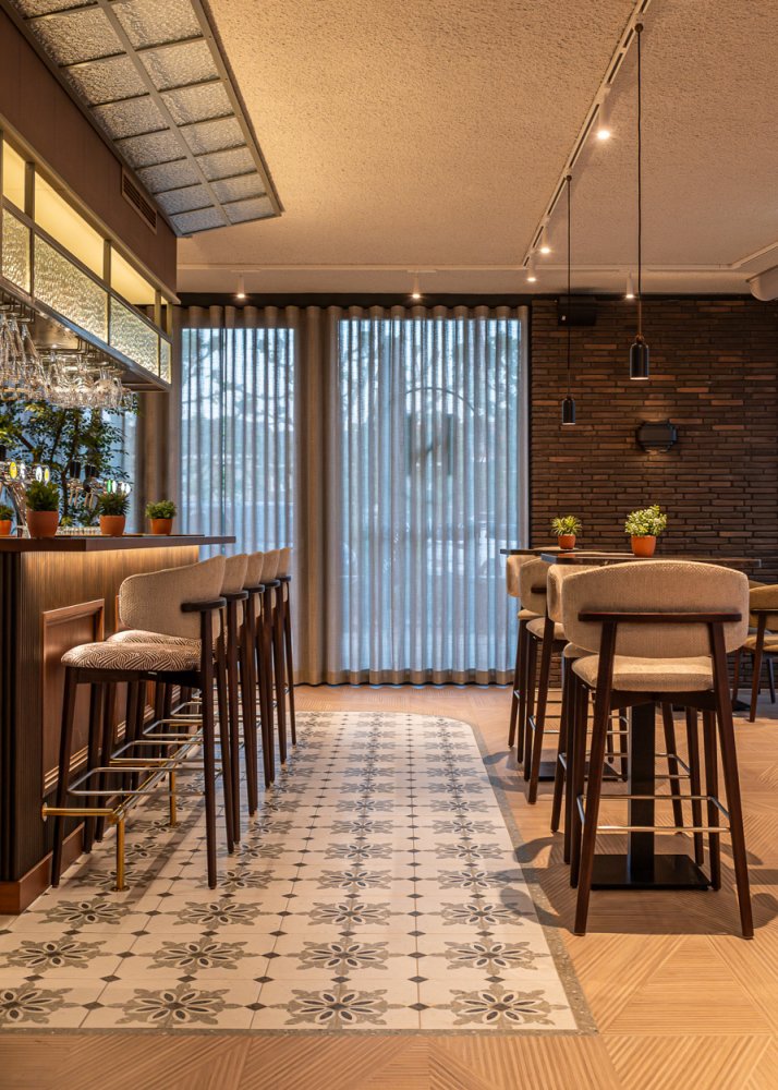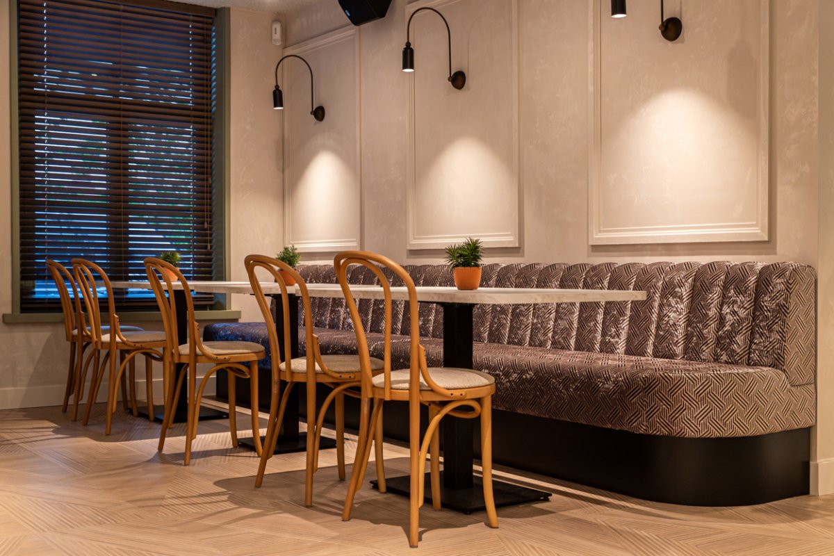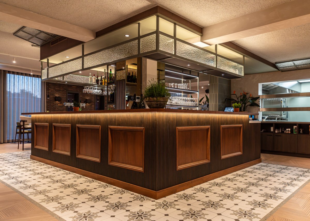 De nieuwe locatie is prachtig: het pand dat ooit dienstdeed als oude ambstwoning – een gemeentelijk monument – onderging een ingrijpende verbouwing. Samen met interieurontwerper Art2Go werd het pand omgetoverd tot een grandcafé met 275 m², zo’n 80 zitplaatsen binnen, 90 terrasplekken en zelfs een ruimte voor private-dining . Materialen als donker hout, marmer, warme stoffen en een mix van lage en hoge tafels geven het geheel een warm, modern én klassiek karakter. De sfeer ademt ‘stadse allure’ zonder dat het afstandelijk wordt – het blijft laagdrempelig wat betreft sfeer, beleving en prijs.